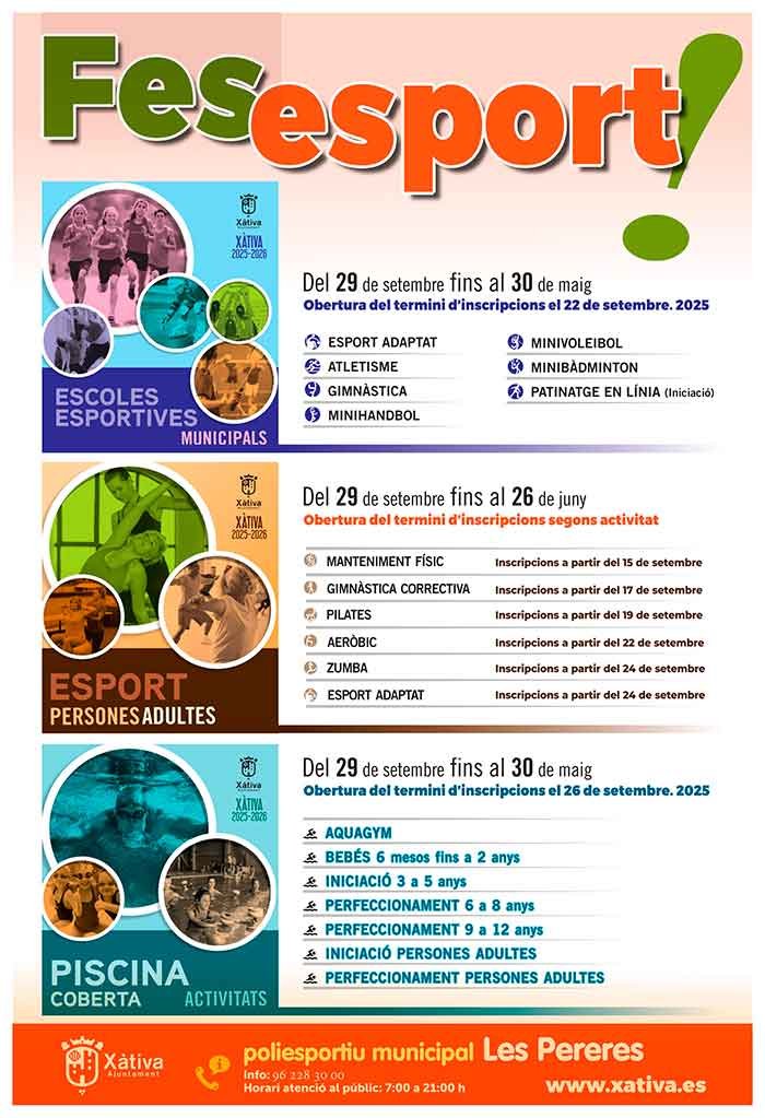 Xàtiva, 5de setembrede 2024.- En breu s’inicia el termini per a inscriure’s en les diferents activitats esportives oferides des de l’Ajuntament de Xàtiva: escoles esportives municipals, esport per a persones adultes i activitats en piscina coberta, les quals s’iniciaran a partir de finals d’aquest mes. Tal i com ve succeint en els darrers anys, les inscripcions es realitzaran de manera escalonada per tal d’evitar llargues cues d’espera.