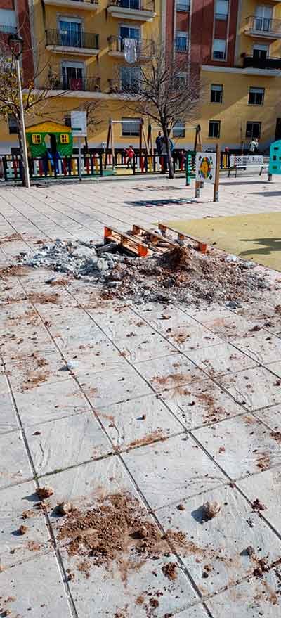 Restes d’obra i arbres sense recollir A més, arran de la plantació de nous arbres en les últimes dues setmanes, s’ha deixat material i restes pel mig del parc. Esta situació suposa un perill de caigudes o accidents per als xiquets i xiquetes que corren per la zona.