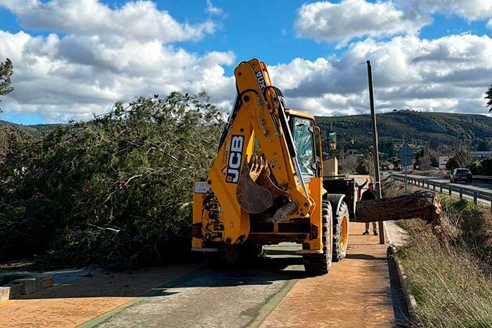 A més, els serveis municipals van procedir a la retirada d’un fanal caigut i de dos pals de telefonia, així com actuacions davant la caiguda de tanques, vidres i senyals verticals de trànsit, i el despreniment de diferents peces i elements constructius, com ara teules o cascots. També es van realitzar tasques de delimitació de perímetres de seguretat en diversos punts, avisos a propietaris perquè actuaren en immobles o elements privats en situació de risc, i la retirada preventiva de lones i altres elements susceptibles de caure a la via pública. Igualment, es va actuar en la retirada de contenidors que havien sigut desplaçats pel vent i en la comprovació dels tancaments dels parcs públics, tant en el moment del tancament preventiu com posteriorment, per garantir que es mantenien les condicions de seguretat. En algunes de les intervencions va ser necessari l’ús de maquinària específica, com ara una pala, per poder retirar elements de grans dimensions i facilitar una actuació segura.