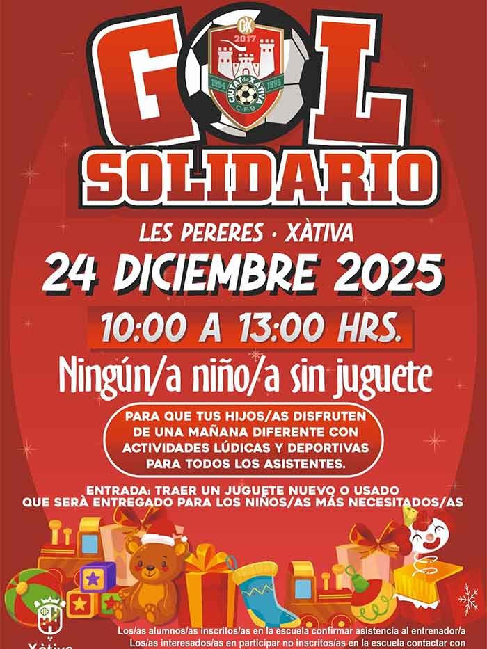 El Ciutat de Xàtiva CFB tornarà a celebrar el pròxim 24 de desembre, de 10:00 a 13:00 hores, una nova edició del seu Gol Solidari, una jornada esportiva i educativa amb un fort component social, que tindrà lloc a la Ciutat de l’Esport (Les Pereres).