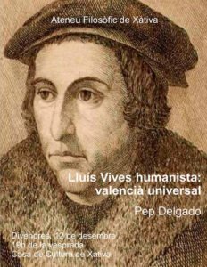 Organitzada per l’Ateneu Filosòfic de Xàtiva, la Casa de la Cultura acull aquest divendres 12 de desembre a les 19.00 hores la xarrada Lluís Vives, humanista i valencià universal a càrrec del membre de l’ateneu i professor jubilat Pep Delgado. Estudiós de Lluís Vives (1492-1540), Pep ens presentarà la figura d’un dels primers defensors en l’Europa renaixentista de l’auxili als pobres, de la solidaritat mitjançant l’assistència social dels més necessitats i de l’educació pública. Les seues idees innovadores i la preocupació per la pau fan hui de Vives un referent excepcional que el ponent aproparà al públic amb la seua intervenció.