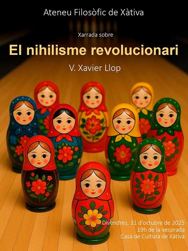 La Casa de la Cultura de Xàtiva acull aquest divendres 31 d’octubre (19 hores) la xerrada-col·loqui El nihilisme revolucionari, a càrrec del professor Xavier Llop. L’acte l’ha organitzat l’Ateneu Filosòfic de Xàtiva, AFX, i és el tercer després de les compareixences de Tobies Grimaltos i la recent de Rafael Gomar, qui va presentar el llibre Walter Benjamin. Passatges acabats. El membre de l’ateneu i professor de Filosofia Josep Ignasi Benito Climent conduirà la intervenció.