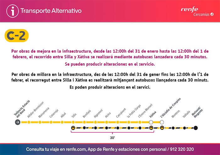 Los usuarios de la Línea C2 de Cercanías y de Media Distancia deberán cambiar el tren por el autobús durante el próximo fin de semana. Debido a trabajos de modernización en la infraestructura ferroviaria, el tráfico de trenes quedará suspendido en el tramo comprendido entre Silla y Xàtiva.