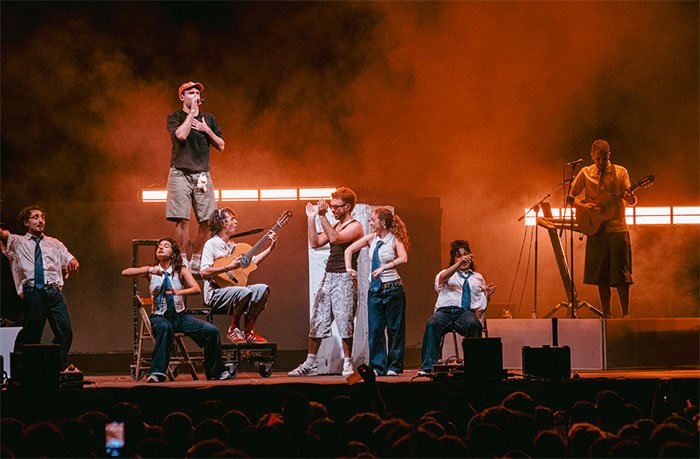 Però tot i l’aquelarre físic de Velasco, venien plats forts encara més potents. I Xalalà sonà com el que ja és, un himne a la despreocupació i les ganes de viure. I el públic, amb més entusiasme i entrega, la cantava amb ells i la Murta era ja un espai màgic i replet de pura felicitat. No es podia baixar el ritme, i sonaren Toca i la ja també imprescindible A la fresKa amb la seua tornada ja famosa («I si no, i si no, i si no m’estima… I si no, i si no, i si no m’estima. A cagar a la vi. A cagar a la via…».) que així de romàntic és canta al desamor en 2025. El bloc el tancà Diabla. En un següent tram, més peces ja totèmiques: Tabarra, Aurora, Espurna… Pep Velasco era la imatge de l’extasi. I no es cansava de escridassar «vingaaaa, Xàtivaaaaaa!» Fins i tot la reina de la Fira, Irene Díez, i la seua cort, es sumaven a la festa de Figa Flawas, eixe grup tan indispensable per als joves com desconegut per als pares. Així és la bretxa generacional.