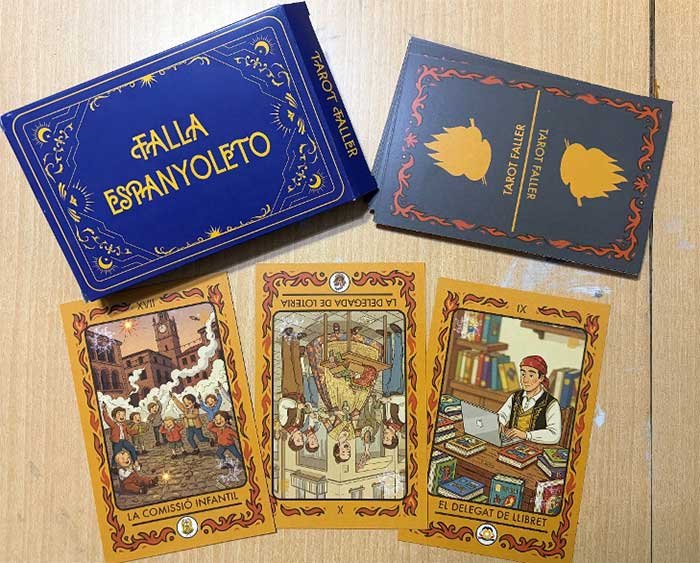 Però si hi ha un element que ha despertat curiositat i somriures a parts iguals és la creació d’un joc de cartes fet expressament amb la temàtica del llibret: el Tarot Faller. Una proposta amb 22 cartes de temàtica fallera pensades per a “esbrinar” el futur de les Falles i, al mateix temps, per a donar peu a molts jocs derivats amb les mateixes cartes.