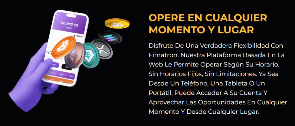 La flexibilidad es una característica distintiva del diseño web de Fimatron. Los traders pueden acceder a la plataforma desde cualquier lugar del mundo, en cualquier momento, usando un smartphone, tablet o computadora.